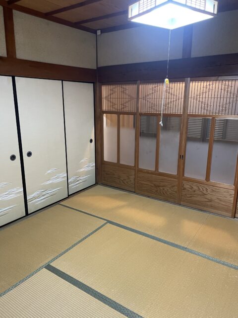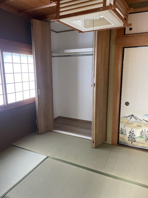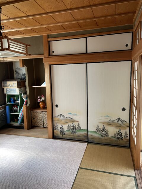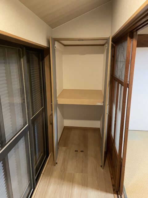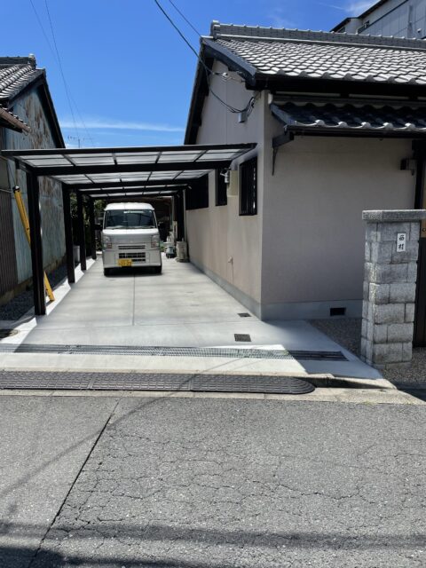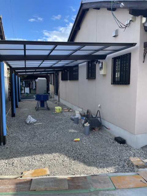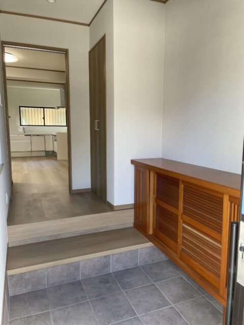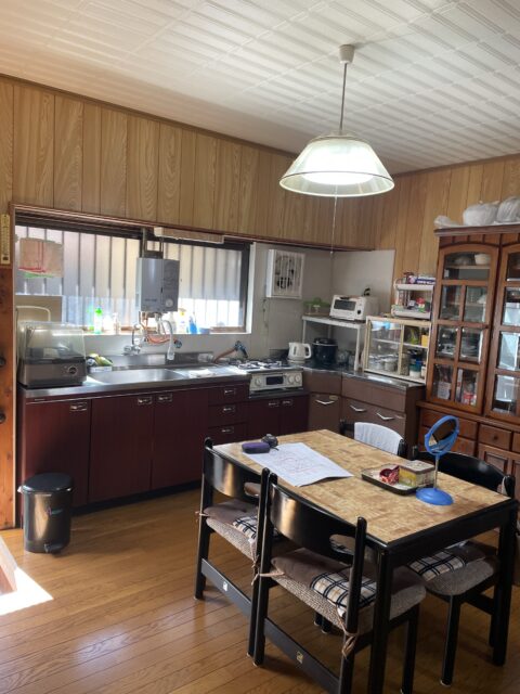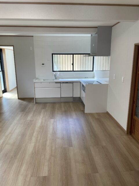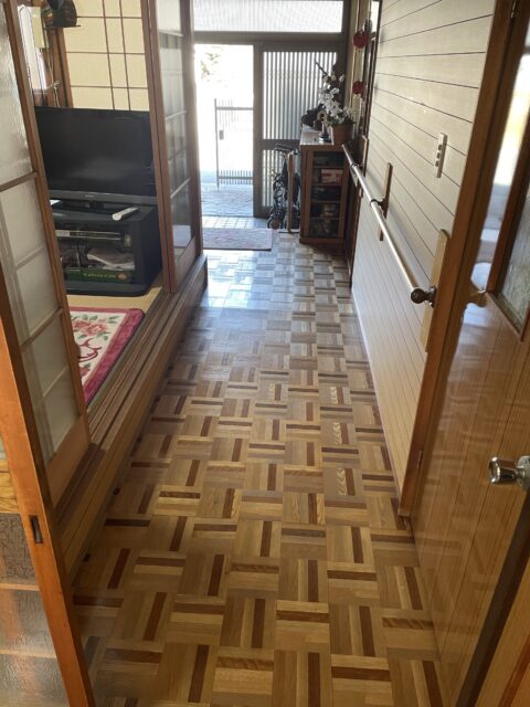 直営築65年の少し前の現場 客間・水廻り部分を減築・減築部分を駐車場スペースに本宅と離れを渡り廊下増築・駐車場からの勝手口新設,間取り変更/居間・DK・廊下を広いLDKに床暖房設置・床の間を収納クローゼットに和室縁側,離れを 段差解消リノベーション出来上がりました。
